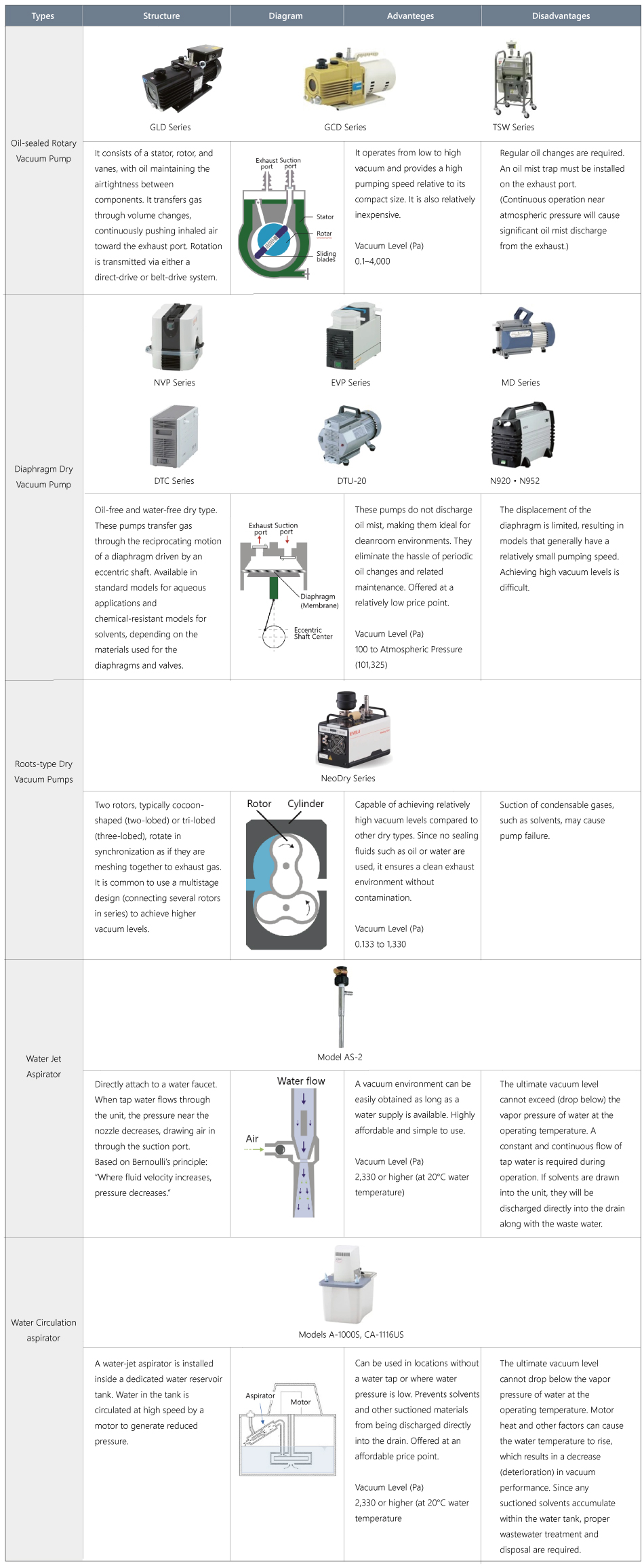 Referring to the “Equipment Types, Pump Categories, and Vacuum Ranges” chart above, identify which type of vacuum pump is suitable for your specific needs.